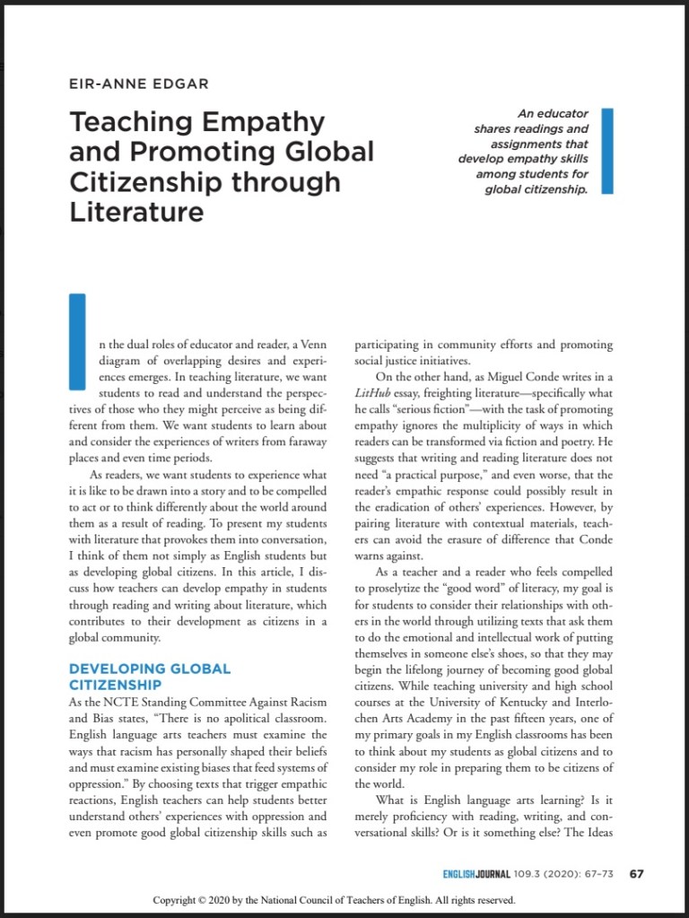 Edgar’s article is about how to teach students empathy and encourage them to become global citizens. Before reading this, I was very unsure of the actual HOW to teach students in a culturally proactive manner, and this article does a great job of breaking down that mystery. Edgar states that texts that call on students to empathize with a character in the story have the strongest effect on student engagement and getting them to think about and consider their actions beyond the classroom. As a teacher, one of my main goals is to teach my students empathy regardless of the school subject, and this article will help me build and design lessons in all of my subject areas that help me meet and exceed that goal.